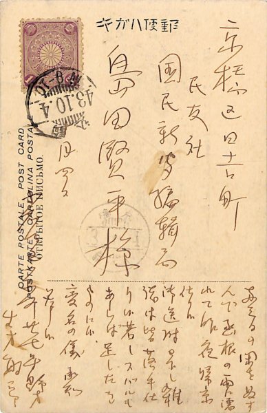 • 解説 島田賢平宛 ペン書 13行 明43・10・4(消印) 箱根絵葉書 帰京の手紙。「十月三日の閑をぬすんで函根の雨に濡れて昨夜帰京仕り候 御送附被下し雑誌は皆落手仕り候 若しスバルもあらば足したきものに候」。(受信地)京橋区日吉町 #八木書店近代自筆物/3.葉書類 #95号近代文学特輯 95201238 ※自筆物につきましては、毎月25日前後に新蒐品を追加しております。PDF形式で御覧になりたい方は https://company.books-yagi.co.jp/archives/news/10928 を参照ください。