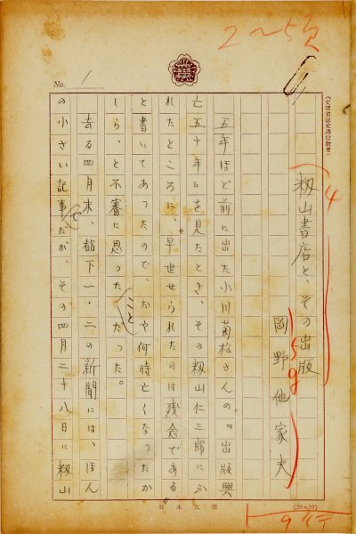 • 解説 『籾山書店と、その出版』 鉛筆書 200字詰原稿用紙24枚完 和装 籾山書店、籾山仁三郎の業績について。(種別)追悼文 #八木書店近代自筆物/1.草稿類 #95号近代文学特輯 95903589 ※自筆物につきましては、毎月25日前後に新蒐品を追加しております。PDF形式で御覧になりたい方は https://company.books-yagi.co.jp/archives/news/10928 を参照ください。