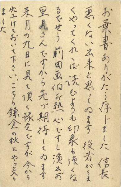 • 解説 斎藤一宛 ペン書 8行 昭27・9・24(消印) おそらく戯曲「若き日の信長」への感想か。「役者がうまくやってくれゝば読むよりも印象も強くなるでせう。前田画伯が熱心ですし演出が里見さんですから先づ期待してゐます」。(受信地)浦和市 #八木書店近代自筆物/3.葉書類 #95号近代文学特輯 95311400 ※自筆物につきましては、毎月25日前後に新蒐品を追加しております。PDF形式で御覧になりたい方は https://company.books-yagi.co.jp/archives/news/10928 を参照ください。