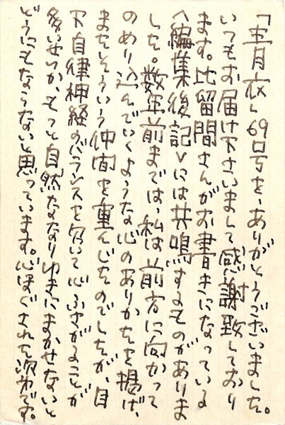 • 解説 比留間一成宛 ペン書 10行 昭60・5・7(消印) 献本礼状。「目下自律神経のバランスを欠いて心ふさがることが多いせいか、もっと自然ななりゆきにまかせないとどうにもならないと思っています」。(発信地)高知市上本宮町(受信地)練馬区光が丘 #八木書店近代自筆物/3.葉書類 #95号近代文学特輯 95404578 ※自筆物につきましては、毎月25日前後に新蒐品を追加しております。PDF形式で御覧になりたい方は https://company.books-yagi.co.jp/archives/news/10928 を参照ください。