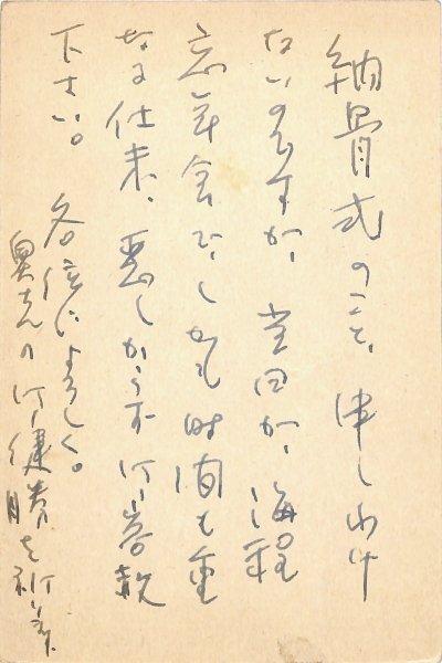 • 解説 橋本静子宛 ペン書 6行 昭49・11・23(消印) 返信葉書 断り状。「納骨式のこと、申しわけないのですが、当日が、海程忘年会で、しかも時間も重なる始末、あしからず御容赦下さい」。(発信地)熊谷市上之(受信地)中央区月島 #八木書店近代自筆物/3.葉書類 #95号近代文学特輯 95509969 ※自筆物につきましては、毎月25日前後に新蒐品を追加しております。PDF形式で御覧になりたい方は https://company.books-yagi.co.jp/archives/news/10928 を参照ください。