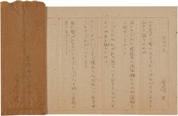 • 解説 『月夜の色』 ペン書 400字詰原稿用紙1枚完 中河幹子宛の封書(昭24・12・13)付。「かき寄せて掌にあまりたるはなびらをあましおきて語り止めぬ」等5首。(種別)短歌 #八木書店近代自筆物/1.草稿類 #八木古書2026年3月新蒐 95713540 ※自筆物につきましては、毎月25日前後に新蒐品を追加しております。PDF形式で御覧になりたい方は https://company.books-yagi.co.jp/archives/news/10928 を参照ください。95号目録(R8.1)以後の追加は「#八木古書2026」で検索できます。
