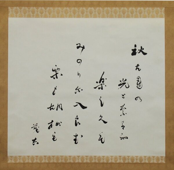 • 解説 45×51 「小園」より 自題共箱 「秋ばれの光となりて楽しくもみのりに入らむ栗も胡桃も 茂吉」 初出は「アララギ」の復刊第一号(昭20・9)。終戦直後の作である。「斎藤茂吉秀歌評釈」(鎌田五郎著)では、敗戦の衝撃と自己激励の思いを季節の豊穣に投影した秀作と評されている。 #八木書店近代自筆物/4.書画類 #95号近代文学特輯 95307000 ※自筆物につきましては、毎月25日前後に新蒐品を追加しております。PDF形式で御覧になりたい方は https://company.books-yagi.co.jp/archives/news/10928 を参照ください。