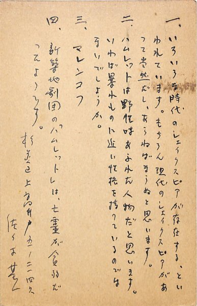 • 解説 文学座編集室宛 ペン書 11行 昭30・4・1(消印) 剥がし跡 「ハムレット」についてのアンケート。「ハムレットは野性味あふれた人物だと思います。いわば暴れものに近い性格を持っているのではないでしょうか」。(受信地)新宿区信濃町 #八木書店近代自筆物/3.葉書類 #95号近代文学特輯 95306898 ※自筆物につきましては、毎月25日前後に新蒐品を追加しております。PDF形式で御覧になりたい方は https://company.books-yagi.co.jp/archives/news/10928 を参照ください。