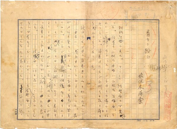 • 解説 『青きを踏む』 ペン書 400字詰原稿用紙35枚完 「女性編輯部」の印、雑誌のカット指定がある。(種別)小説 #八木書店近代自筆物/1.草稿類 #95号近代文学特輯 95109547 ※自筆物につきましては、毎月25日前後に新蒐品を追加しております。PDF形式で御覧になりたい方は https://company.books-yagi.co.jp/archives/news/10928 を参照ください。