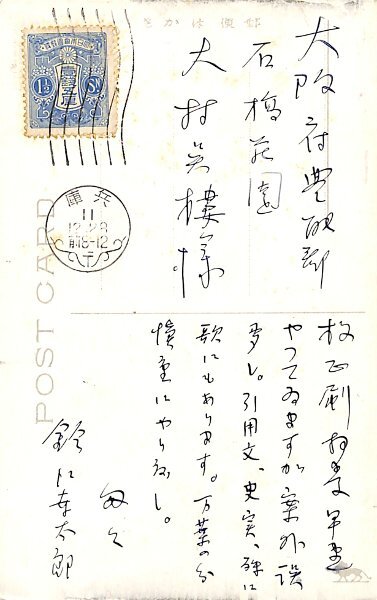 • 解説 大村呉樓宛 ペン書 7行 昭11・12・28(消印) 神戸湊川神社絵葉書 絵葉書だが、編集のやりとり。「校正刷拝受 早速やつてゐますが案外誤多し。引用文、史実、殊に歌にもあります。万葉の分愼重にやり度し」。(受信地)石橋荘園 #八木書店近代自筆物/3.葉書類 #95号近代文学特輯 95007847 ※自筆物につきましては、毎月25日前後に新蒐品を追加しております。PDF形式で御覧になりたい方は https://company.books-yagi.co.jp/archives/news/10928 を参照ください。