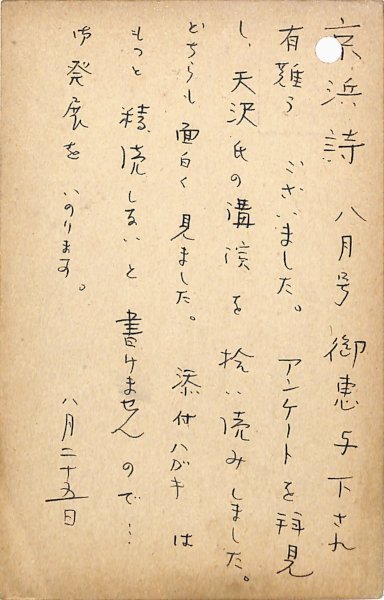 • 解説 竹内多三郎宛 ペン書 6行 昭39・8・25(消印) パンチ穴 献本礼状。「アンケートを拝見し、天沢氏の講演を拾い読みしました。どちらも面白く見ました。添付ハガキはもっと精読しないと書けませんので…御発展をいのります」。(発信地)大分県(受信地)川崎市 #八木書店近代自筆物/3.葉書類 #95号近代文学特輯 95505798 ※自筆物につきましては、毎月25日前後に新蒐品を追加しております。PDF形式で御覧になりたい方は https://company.books-yagi.co.jp/archives/news/10928 を参照ください。