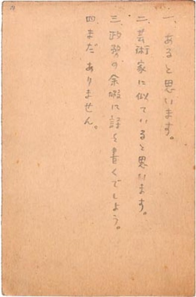 • 解説 文学座編集室宛 鉛筆 4行 昭30・4・2(消印) 剥がし跡 「ハムレット」についてのアンケート。「芸術家に似ていると思います」。(受信地)新宿区信濃町 #八木書店近代自筆物/3.葉書類 #95号近代文学特輯 95008176 ※自筆物につきましては、毎月25日前後に新蒐品を追加しております。PDF形式で御覧になりたい方は https://company.books-yagi.co.jp/archives/news/10928 を参照ください。