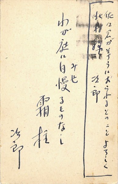 • 解説 北村卓三宛 ペン書 5行 昭35・11・1(消印) 返信葉書 汚れ 知人が三友社に入ったか。「佐々君がそちらにおられるとのこと よろしく 北村様 次郞 わが庭に自慢(みせ)るものなし霜柱 次郞」。(発信地)吉祥寺(受信地)三友社 #八木書店近代自筆物/3.葉書類 #95号近代文学特輯 95603469 ※自筆物につきましては、毎月25日前後に新蒐品を追加しております。PDF形式で御覧になりたい方は https://company.books-yagi.co.jp/archives/news/10928 を参照ください。