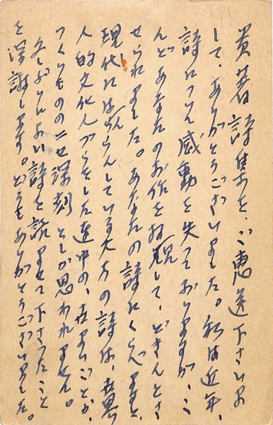• 解説 宮崎譲宛 ペン書 10行 昭37・5・7(消印) 住所氏名印 剥がし跡 献本礼状。「私は近年、詩について感動を失つておりますが、こんどあなたのお作を拝見して、どきんとさせられました。」。(発信地)豊島区巣鴨(受信地)三鷹市下連雀 #八木書店近代自筆物/3.葉書類 #95号近代文学特輯 95104709 ※自筆物につきましては、毎月25日前後に新蒐品を追加しております。PDF形式で御覧になりたい方は https://company.books-yagi.co.jp/archives/news/10928 を参照ください。