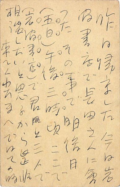 • 解説 葛巻義敏宛 ペン書 7行 昭7・9・3(消印) 岩波書店との打合せについて。「明後日(五日)午後三時頃ここで(岩波書店)で君と三人で相談したいと思ふから是非来てくれたまへ」。(受信地)市外田端 #八木書店近代自筆物/3.葉書類 #95号近代文学特輯 95210299 ※自筆物につきましては、毎月25日前後に新蒐品を追加しております。PDF形式で御覧になりたい方は https://company.books-yagi.co.jp/archives/news/10928 を参照ください。