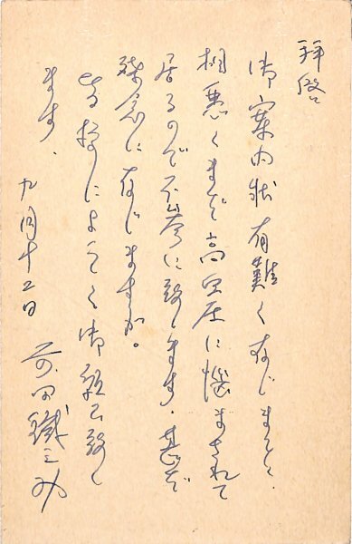 • 解説 文章世界の会宛 ペン書 8行 昭33・9・12(消印) 不参加の知らせ。「相悪くまだ高血圧に悩まされて居るので不参に致します。甚だ残念に存じますが」。(発信地)練馬区南田中町(受信地)中野区上高田 #八木書店近代自筆物/3.葉書類 #95号近代文学特輯 95510757 ※自筆物につきましては、毎月25日前後に新蒐品を追加しております。PDF形式で御覧になりたい方は https://company.books-yagi.co.jp/archives/news/10928 を参照ください。