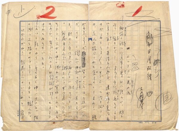 • 解説 『敵討日月双紙』エレクテル鼠の話 ペン書 400字詰原稿用紙1枚半 掲載誌不明。標題作の1枚目と4枚目後半にあたる。半裁3枚。 #八木書店近代自筆物/1.草稿類 #95号近代文学特輯 95505659 ※自筆物につきましては、毎月25日前後に新蒐品を追加しております。PDF形式で御覧になりたい方は https://company.books-yagi.co.jp/archives/news/10928 を参照ください。