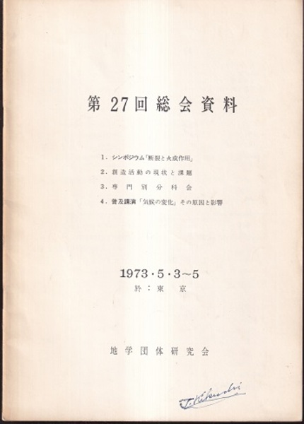 地学団体研究会第27回総会資料 1973・5・3~5 於:東京 1.シンポジウム「断裂と火成作用」 2.創造活動の現象と課題 3.専門別分科会 4.普及講演 「気候の変化」その原因と影響