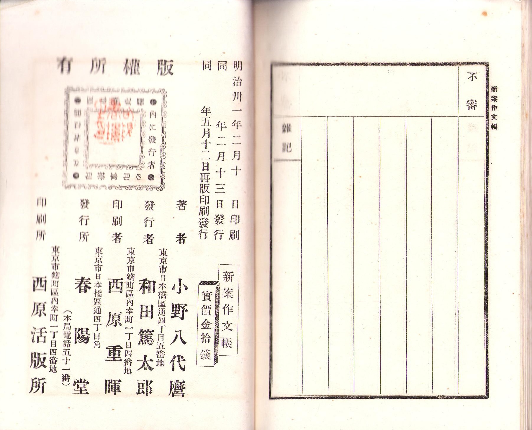 • 解説 再版、本文69頁、後半は記入欄、裏表紙汚れ・記名、後部見返しに印