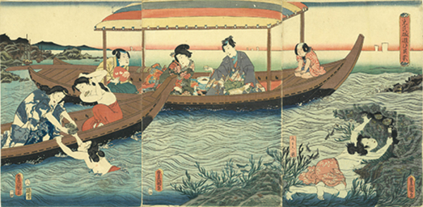 • 解説 伊勢鮑取りの図 三鉄版 大判錦絵37.2×25.5糎 3枚続