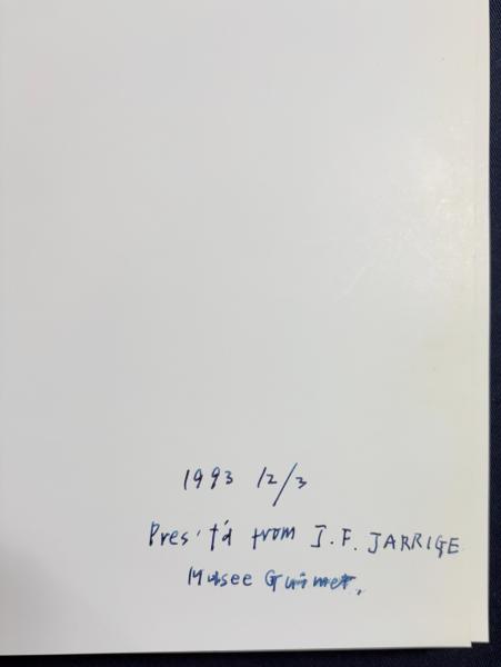 扉ページにフランスの著名な考古学者で、当時のギメ東洋美術館の館長,ジャン=フランソワ・ジャリージュ(Jean-François Jarrige)による謹呈の書入れ有り。