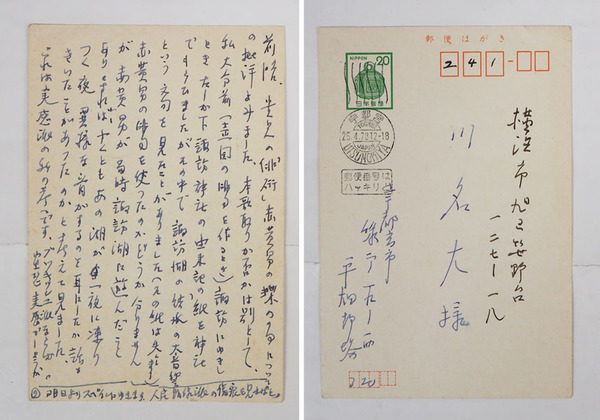 平畑静塔葉書 川名大宛 ペン書14行 『…赤黄男の俳句を使ったのかどうか分かりませんが…』
