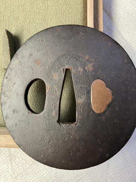 • 解説  鉄鐔 越前住 赤尾 銘  模様なし  厚さ3~4㎜ 重さ120g 径7cm。 桐函付。  ゆうメール定形外で発送  *2603