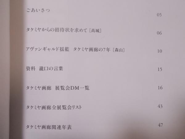• 解説 ●送料は厚紙ケースに入れて、「クリックポスト」なら185円です。●展覧会場:慶應義塾大学アート・スペース●瀧口修造が深く関わったタケミヤ画廊(1951-1957)の展覧会案内状に着目した展覧会。画像のとおり、所在確認が出来ず、案内状の写真がない空欄も少なくない。小振りで薄い図録です。●コンディション:半透明カバーに軽い波打ちがあるくらいで、おおむね良好です。