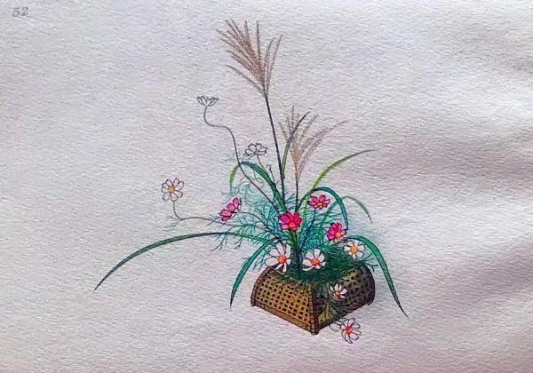 彩色石版画 芒にコスモス 盛花 西洋花 生花図譜 華道 生花 解説付き 昭和年代〇和本古書古文書
