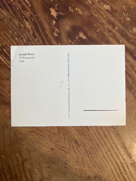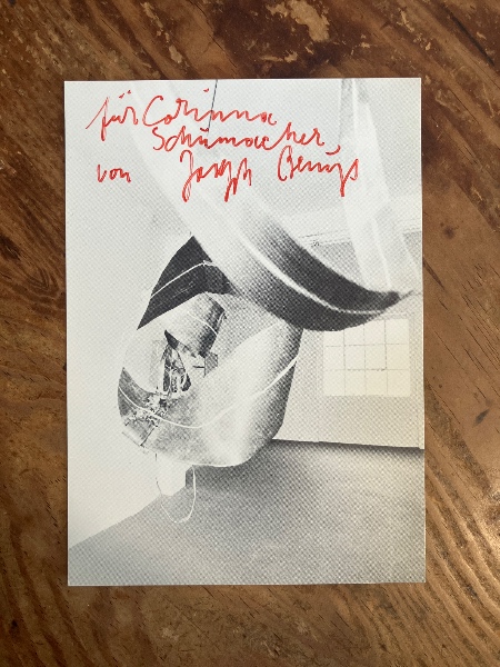 • 解説 Mobiuswerferという作品の絵葉書。1984年のデュッセルドルフのコンラート・フィッシャー画廊での展覧会の絵葉書。「für Corinna Schumacher von Joseph Beys」と朱のペンで献辞。Möbiuswerfer 1984 (exhibition at Konrad Fischer Gallery, Düsseldorf) postcard signed by Beuys with red pencil.