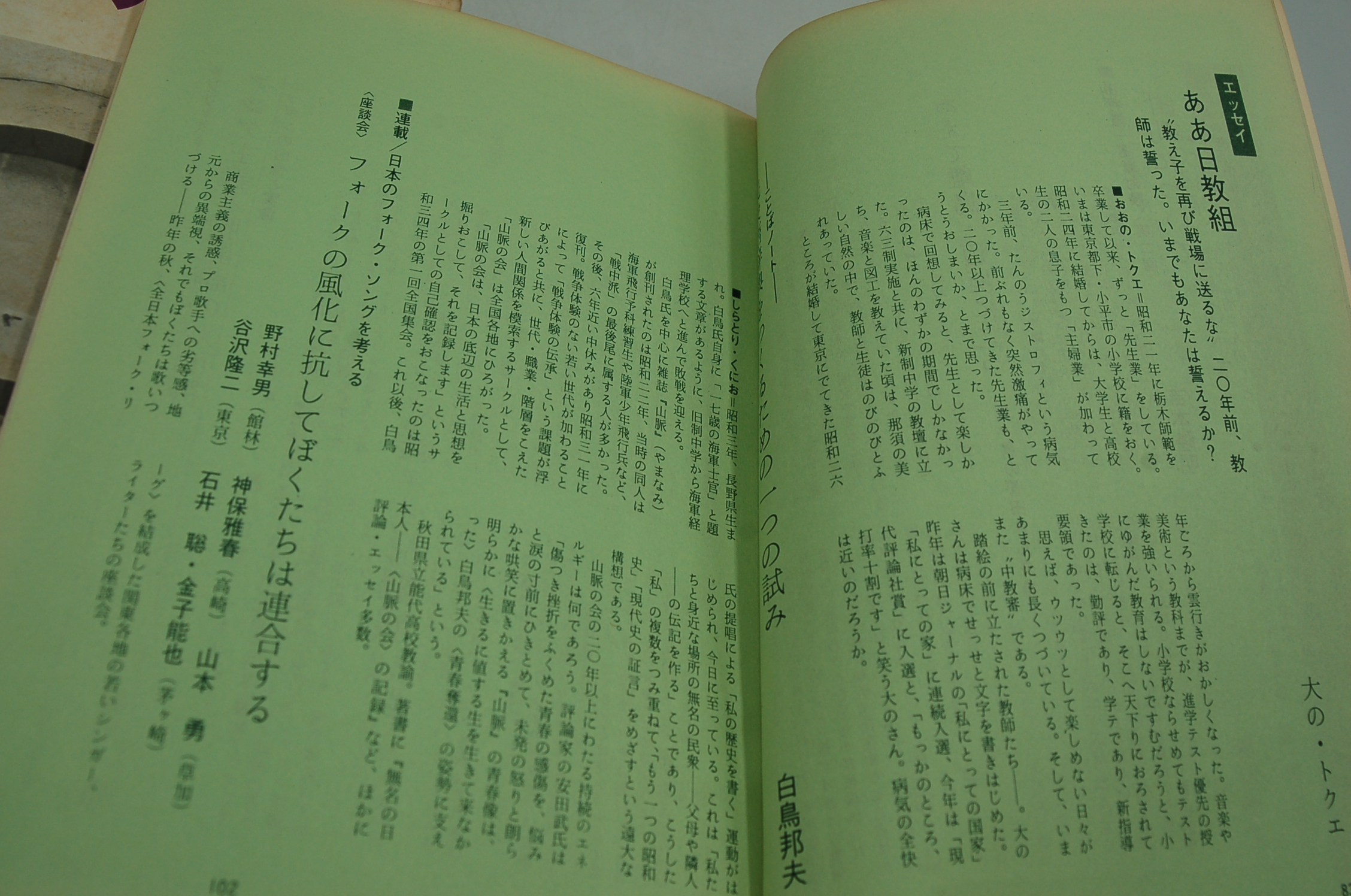 井沼章「ミサイルがそこまでやってきた 青森県・車力村からの現地報告」、藤川治水「「あつい壁」から「」水俣」へ 熊本における映画運動始末書、田村隆一・谷川俊太郎(対談)、高田渡「みんな思想がなさすぎる 歌手仲間のなれあいはゴメンだ」、高岡良樹「地域歌手宣言」・・・