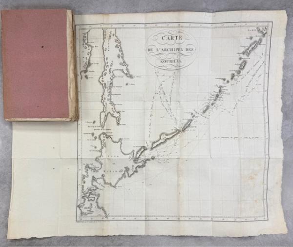 • 解説 フランス語版初版、ソフトカバー・A5・396+452頁、1巻巻頭に高田屋嘉兵衛肖像銅版画、巻末に折込地図1葉(細かなシミ)、表紙にヤケ、縁周りに少し痛み、背題箋に痛み、三方にヤケ、細かなシミ、中にもシミがありますが良好です