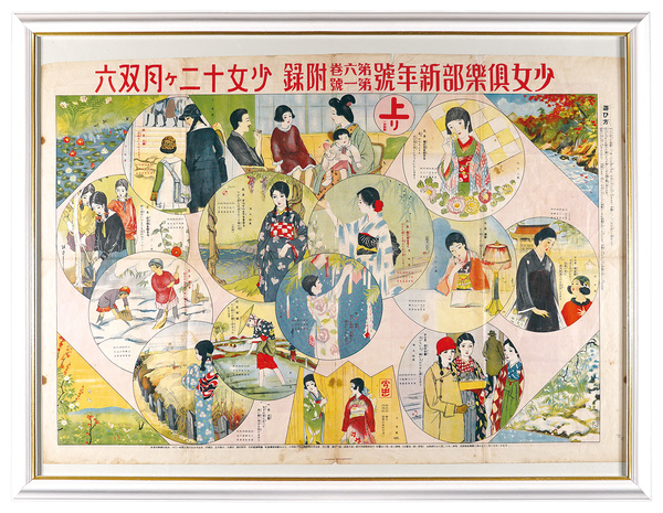 • 解説 オフセット 55×78.2cm(シートサイズ)額装 1面Frame シミ マージン傷ミ  画:恒春/春久/千里 講談社 「少女倶楽部新年号」附録