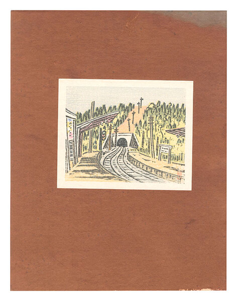 • 解説 木版 11.8x14.8cm(イメージサイズ)/34.7x26.8cm(台紙サイズ)ed.1001枚概ね良好  「きつつき版画集 第1号」より 自刻自摺 台紙(裏面に題箋の貼付。一部冠水シミ有)に貼付
