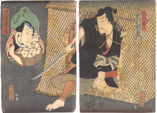 • 解説 Woodblock Print大判2枚続摺良 右図裏打 極少虫穴 少薄汚レ 少傷ミ 少折レ 左図裏面1ヶ所毛筆書込 左から 幡隨長兵衛/河原崎権十郎 白井権八/市村羽左衛門