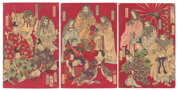 • 解説 Woodblock Print大判3枚続摺良 トリミング 破レ補修 虫穴 傷ミ 切レ シワ 端部貼付剥がし跡・小紙片貼付 左から 百十八代 後桃園天皇 百二十代 仁孝天皇 彦波瀲武??草葺不合尊 百十九代 光格天皇 彦火々出見尊 陰神 伊弉冊尊 百二十二代 今上天皇(明治天皇) 国常立尊 今上皇后(昭憲皇太后) 陽神 伊弉諾尊 百二十一代 孝明天皇 天照大神大日?貴 百十七代 後桜町天皇 天彦火瓊々杵尊 人皇一代 神武天皇