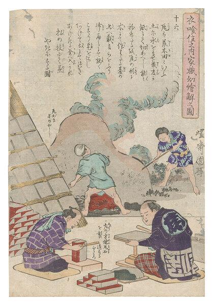 • 解説 Woodblock Print大判1枚摺良 トリミング 虫穴補修 少ヤケ 折レ 少シワ 一部薄ミ 文部省発行教育錦絵 瓦・煉瓦の製法の図
