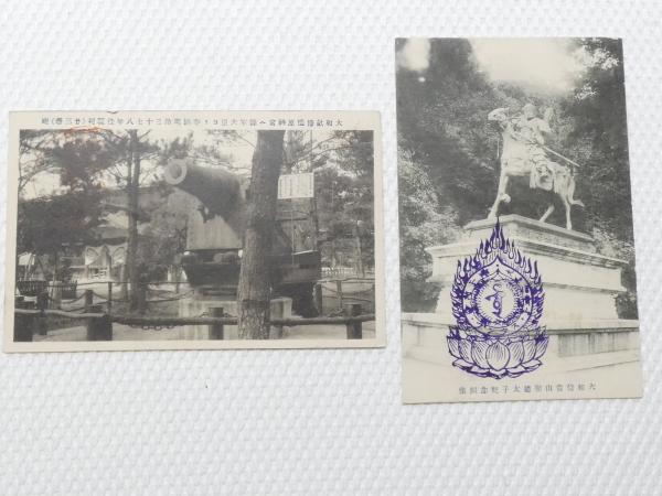 1000336■戦前 絵葉書■ 大和國畝傍橿原神宮 明治三十七八 大砲+大和信貴山聖徳太子記念銅像