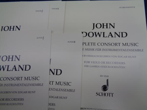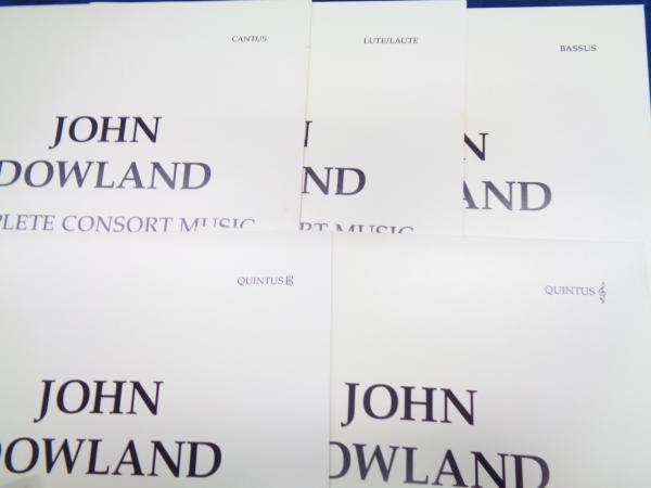 輸入楽譜/ヴォーカル譜/ダウランド/コンソート曲集JOHN DOWLAND COMPLETE CONSORT MUSIC/Pieces for 5 Viols or Recorders. 5 strings or 5 recorders (SATTB) and basso continuo (lute, Noten and Tabulatur; harpsichord, organ)./パート譜9冊+指揮譜