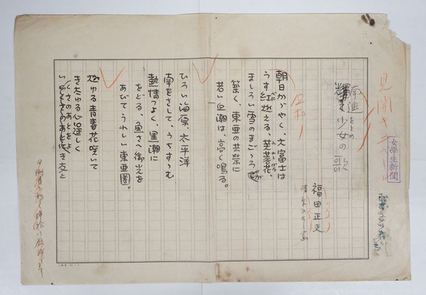福田正夫詩稿 『南進少女の歌』 ペン書四百字詰2枚完 痛余白少欠有シミ有 「女學生新聞」のゴム印有