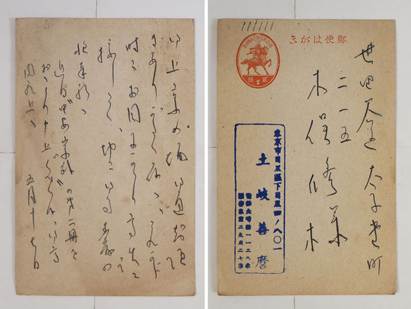 土岐善麿葉書 木俣修宛 ペン書7行 署名はスタンプ印 戦前