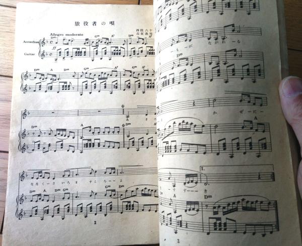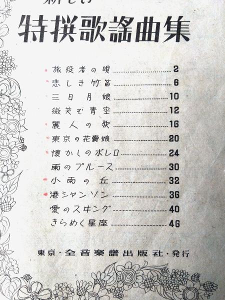 楽譜【新しい特撰歌謡曲集】「旅役者の唄・悲しき竹笛・三日月娘・微笑む青空・麗人の歌・東京の花売娘・懐かしのボレロ他」等