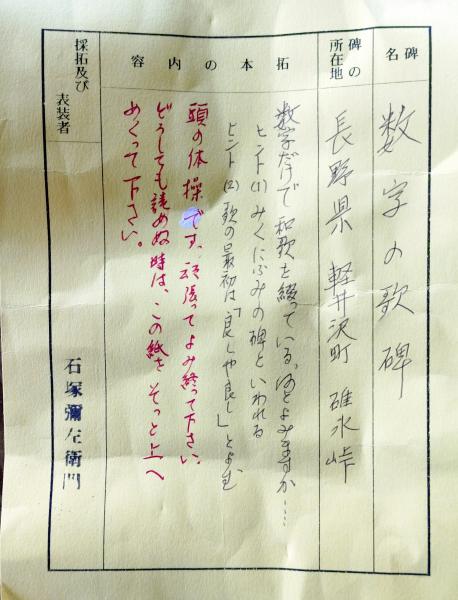 拓本幅 数字の碑 よしやよし 何はおくとも 御国文 よくと よままし 文読まん人 長野県 軽井沢 碓氷峠 石塚弥左衛門先生採拓表具〇和本古書古文書