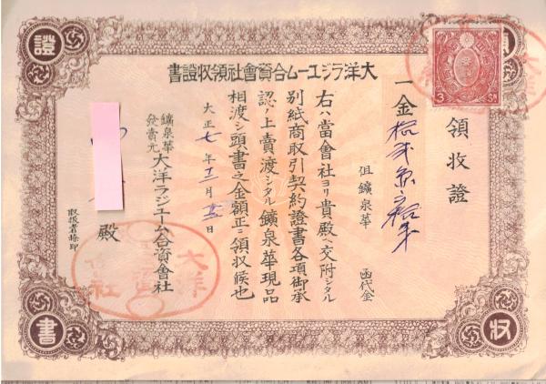 ※大正七年大洋ラジユーム合資會社契約證書&領収書 (鉱泉華発売元・湯の華・ラジウム)
