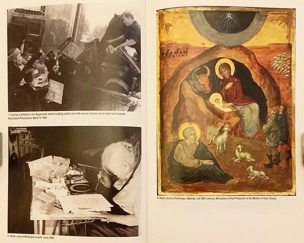 アトリエで制作に向かう修道女の姿や、焼却のために集められたイコンの記録写真は、抑圧と継承が同時に進行していた現実を生々しく伝える。