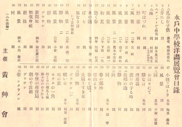 ※水戸中学洋画天覧會目録 乳呑む子供、芽出し=熊岡美彦・ルノアールの模写=鈴木良三ほか 主催:黄艸會