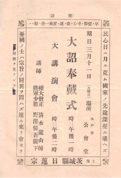 ※我等の宣誓 茨城縣日蓮宗 大詔奉戴式:講師権大僧正清水龍山・陸軍少将野澤悌吾閣下
