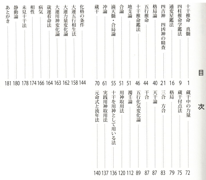 【目次】●十干推命 真髓 ●四柱推命学鑑法 ●通変星鑑法 ●四吉神 四凶神の精査 ●格局論 ●五行推命 ●十干推命鑑法 ●地支論 ●合論 ●滴天髓・合局論 ●冲論 ●蔵干 ●蔵干中の力量 ●蔵干付点法 ●格局 ●三合 方合 ●天干論 ●干合 ●五行化気変化論 ●濁壬論 ●用神取用法 ●十干を用神として用いる法 ●実践用神取用法 ●元命式と流年法 ●化格の条件 ●大運五行相生法 ●大運力量変化論 ●大運用神変化論 ●歳運看命法 ●病気 ●相性 ●未見十干法 ●静動論 ●あとがき
