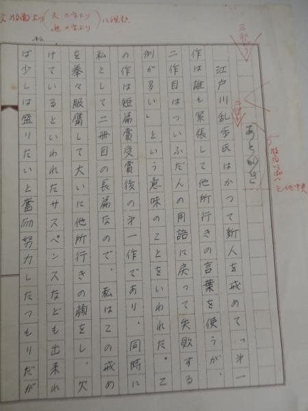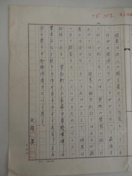 天藤真 直筆原稿 400字詰原稿用紙1枚江戸川乱歩史はかつて新人を戒めて・・・岩谷書店編集者旧蔵1962年、旧『宝石』に投稿した『親友記』が宝石賞に佳作入選して、作家活動を開始。また同年『陽気な容疑者たち』が第八回江戸川乱歩賞の最終候補となり、大下宇陀児らの推薦を得て翌年刊行に至る。1963年、『鷹と鳶』で第二回宝石賞を受賞。1979年、『大誘拐』で第三十二回日本推理作家協会賞を受賞。