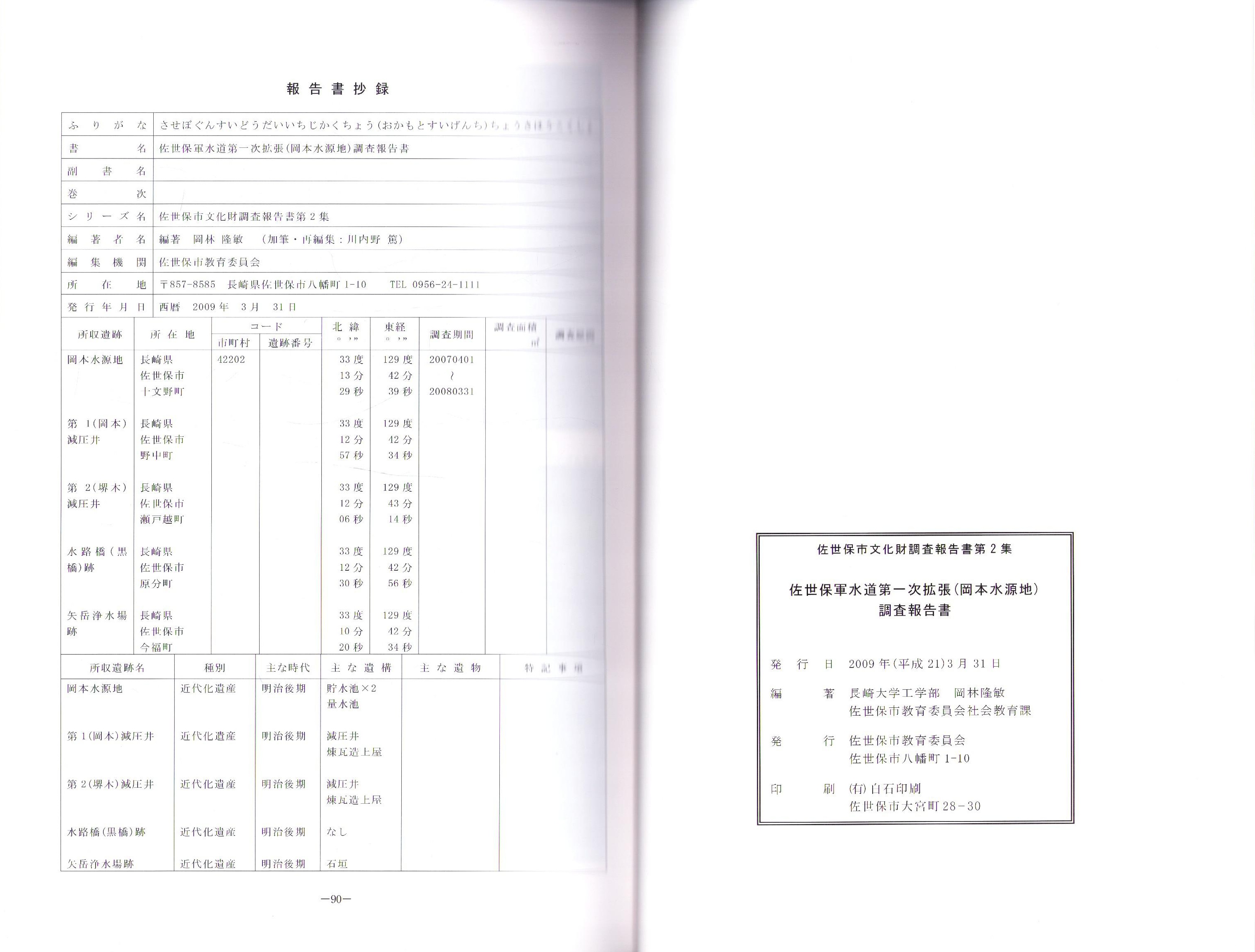 佐世保軍水道第一次拡張(岡本水源地)調査報告書 -佐世保市文化財調査報告書第2集-(長崎県)