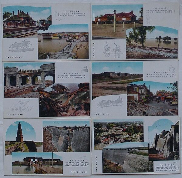 • 解説 ハガキ 彩色 未使用 袋ナシ 特段の瑕疵ナシ 状態良 静海県駅に小休止・滄県城門上より見たる城外/馬廠駅頭の皇軍・揚柳青いったいの浸水/石家荘陸橋を爆撃直後の皇軍・猛攻粉砕したる石家荘機関庫/正定城城壁・石家荘市街の一部/徳県城城壁・滄県城門/保定西門の要害・保定城北門より城内ょ望む・保定城壁上を行進の無敵皇軍