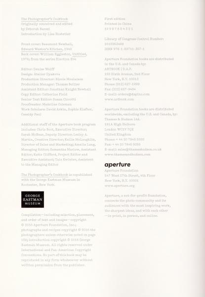 A photobook that brings together favorite recipes by photographers, including Richard Avedon, William Eggleston and many more, along with photographs related to food and cooking.