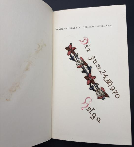 • 解説 扉に恐らく刺繍で作られた飾りと書込み・反対の頁に飾りの跡、(画像2枚目)表紙・裏表紙に薄汚れ、見返しに小シミがございます。