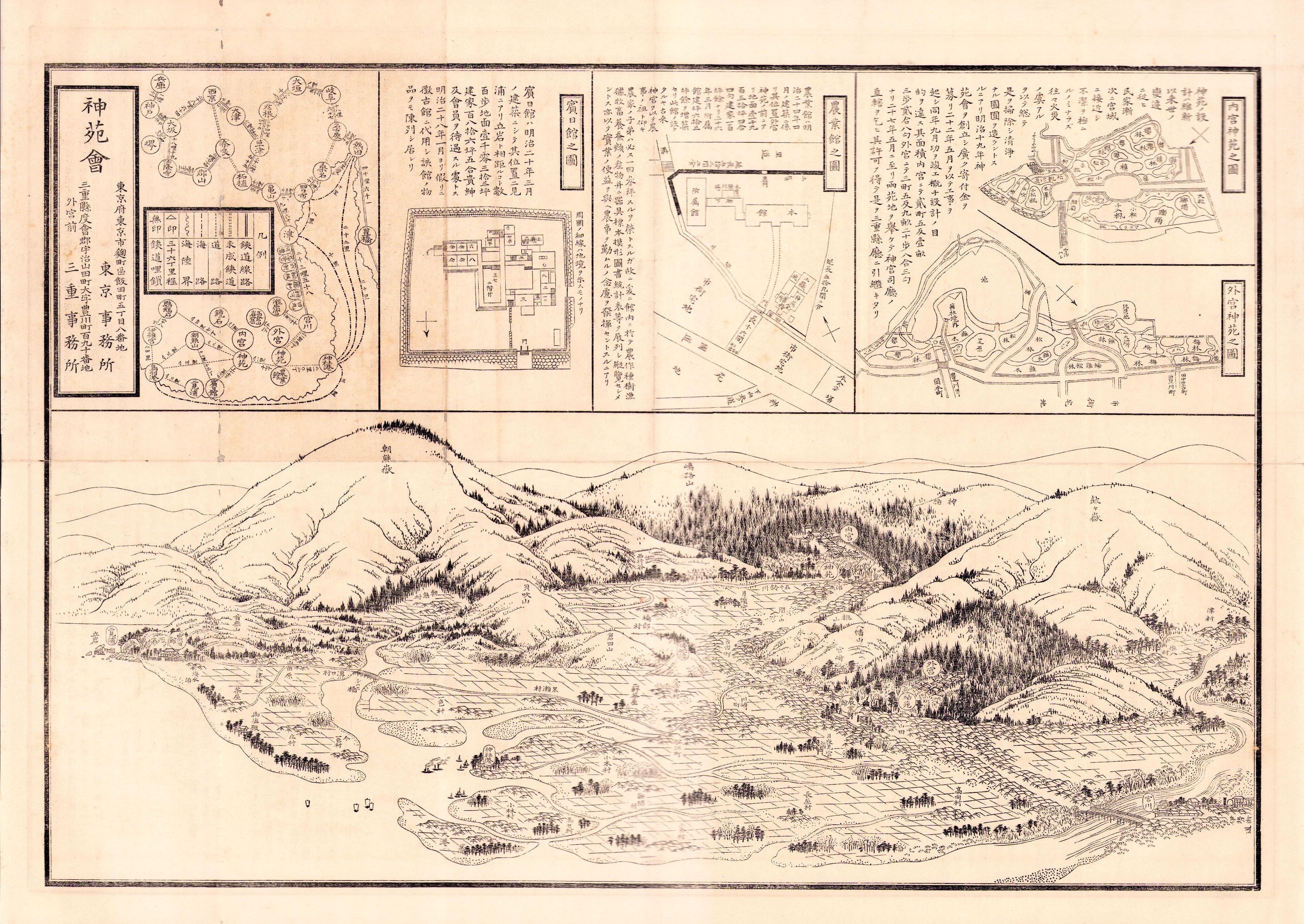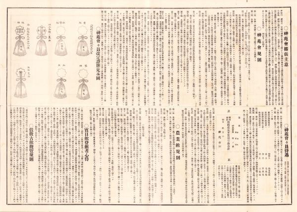 • 著者 〈おもて 内宮神苑之図、外宮神苑之図、農業館之図、賓日館之図ほか〉〈裏 神苑会規則、神苑会々員改定證牌見本図、神苑会々員待遇、農業館規則、賓日館登館者心得、仮徴古館観覧規則〉